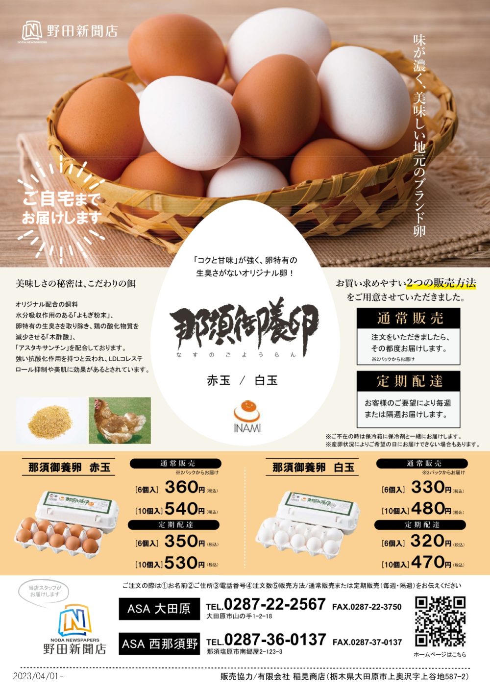 2025年6月30日2025年6月30日 お知らせ那須御養卵のご案内 稲見商店 × 野田新聞店 通常販売はもちろん定期的にお届けする定期配達コースもご用意しました。 ぜひこだわりの卵をご賞味ください。 ご注文はこちらから! 御養鶏キーマカレー 御養鶏のひき肉を使用 トマトと15種類のスパイスが 効いた!旨さやみつき! 絶品キーマカレー(中辛)150g ¥432 詳細を見る 地養卵たまごかけしょうゆ 那須御養卵の美味しい召し上がり方はまずは卵かけご飯で とてもおいしく卵との相性抜群 冷奴、納豆などにも合います 地養卵たまごかけしょうゆ 150ml ¥540 詳細を見る 那須御養卵の明太マヨソース かけてワンランクアップ 那須御養卵を贅沢に使用した 明太マヨディップソース 90g ¥794 詳細を見る